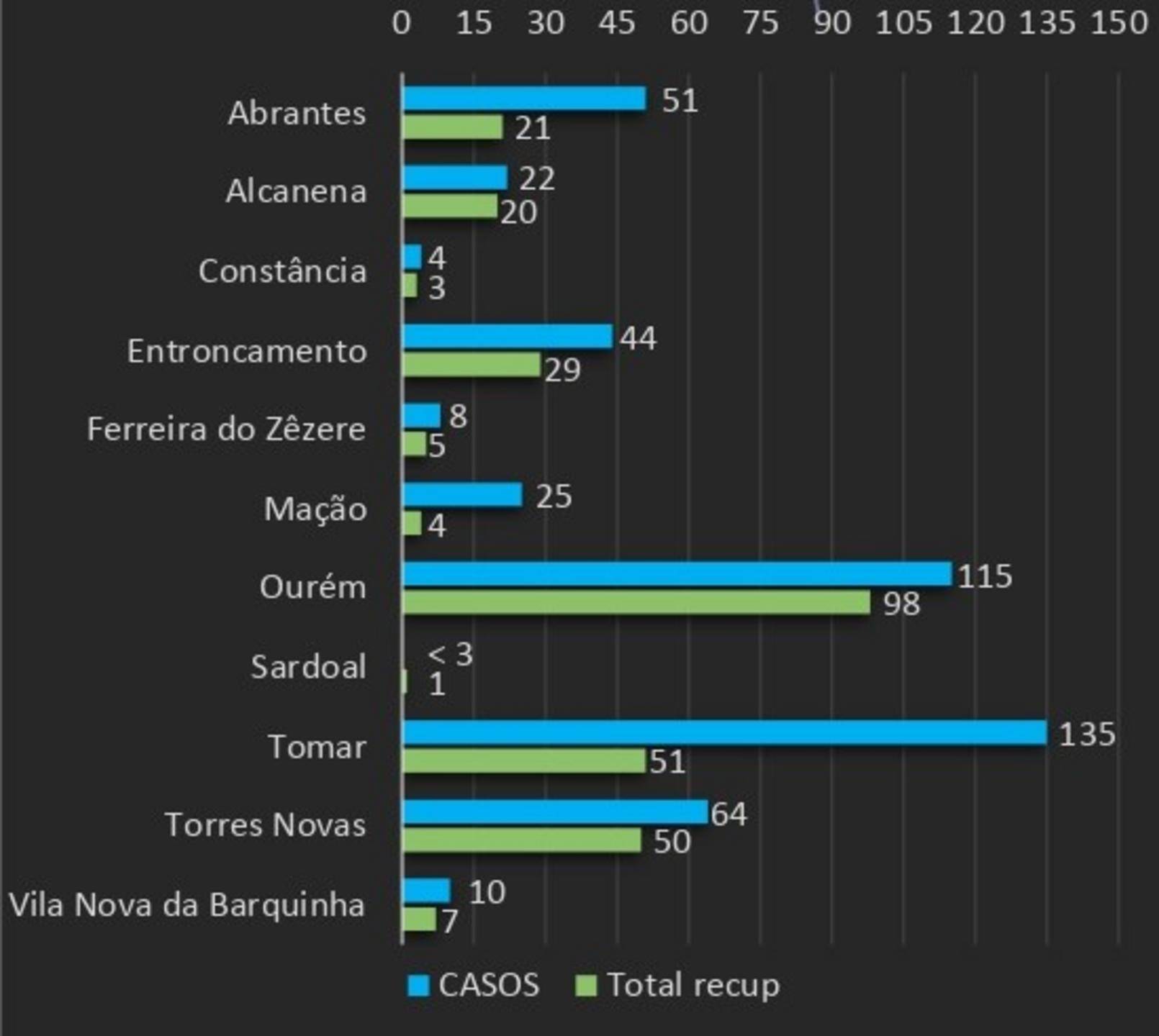 No global, o relatório epidemiológico da Unidade de Saúde Pública do ACES Médio Tejo dá conta que os casos ativos de infeção se registam em Abrantes (30), Alcanena (2), Constância (1), Entroncamento (15), Ferreira do Zêzere (3), Mação (21), Ourém (17), Tomar (84), Torres Novas (14) e Vila Nova da Barquinha (3).