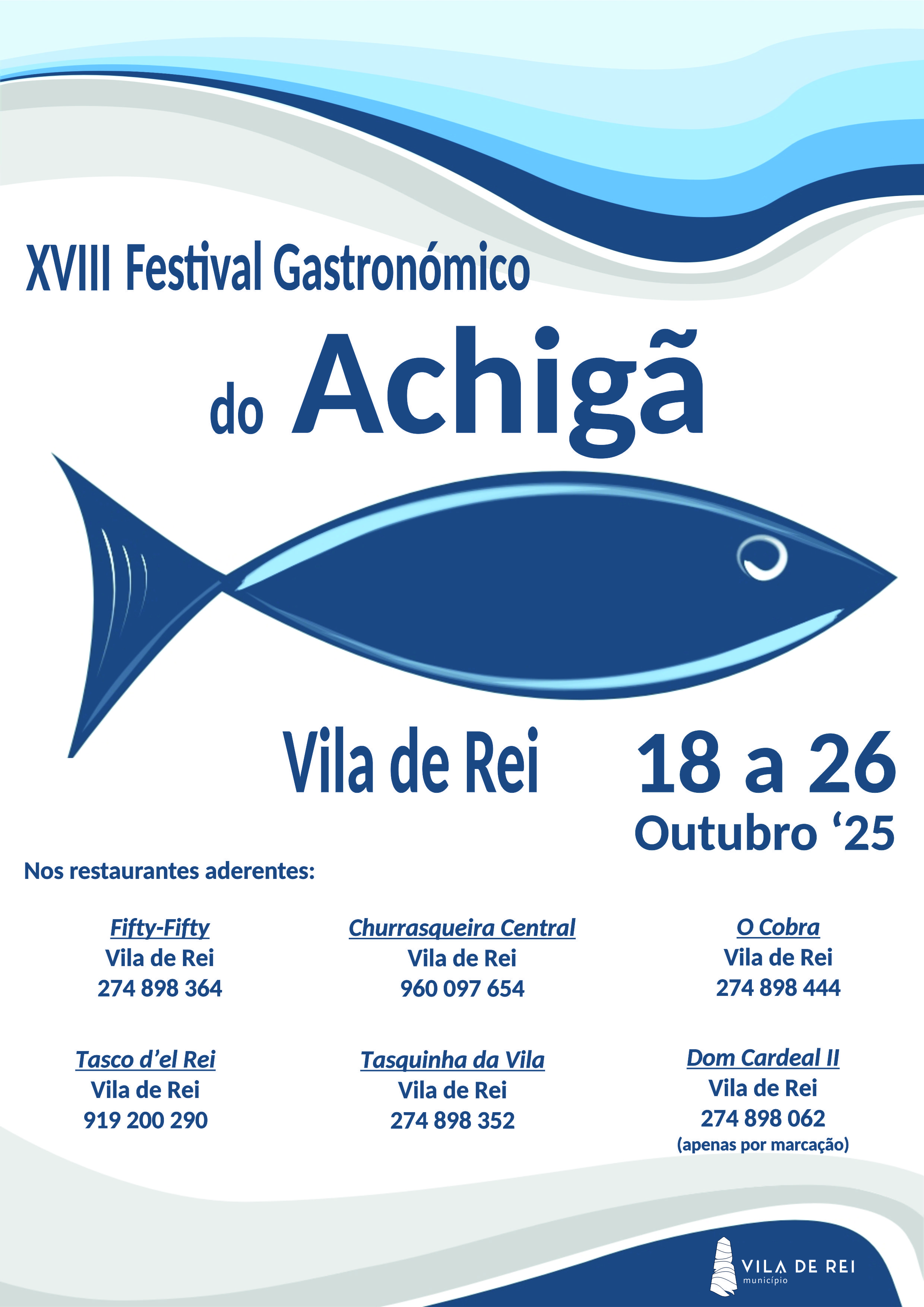 O Município de Vila de Rei promove, entre os dias 18 e 26 de outubro, a 18.ª edição do Festival Gastronómico do Achigã, evento que já se afirmou como uma das principais iniciativas gastronómicas do concelho e da região centro.