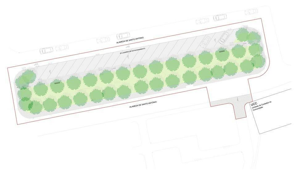No lado oposto, na Alameda de Santo António, será criada a nova bolsa de estacionamento. A intervenção requer um novo ordenamento de parte da área ajardinada, mantendo intactas as figuras escultóricas instaladas no jardim. O Presidente da Câmara explicou que os serviços técnicos projetaram esta futura intervenção procurando o equilíbrio entre o espaço natural e a necessidade da população que estaciona nesta artéria.