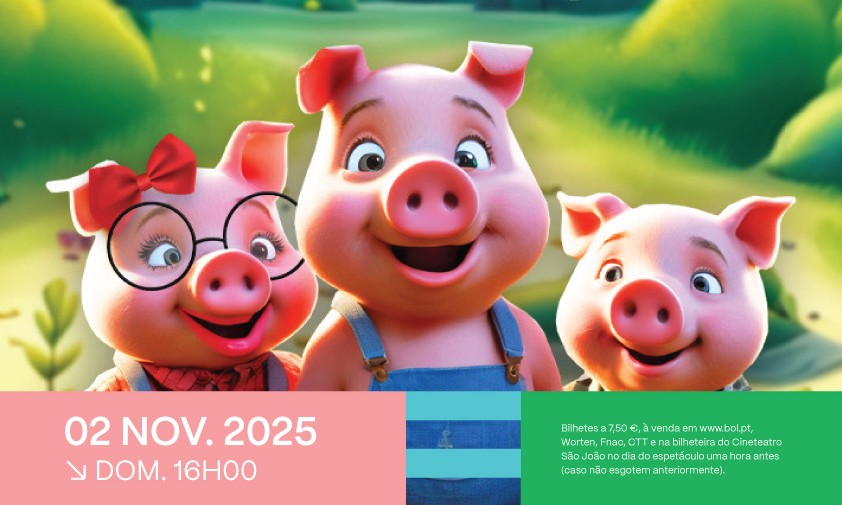 O Cineteatro São João recebe, no dia 2 de novembro, domingo, pelas 16h00, o Teatro Infantil “Os Três Porquinhos”.