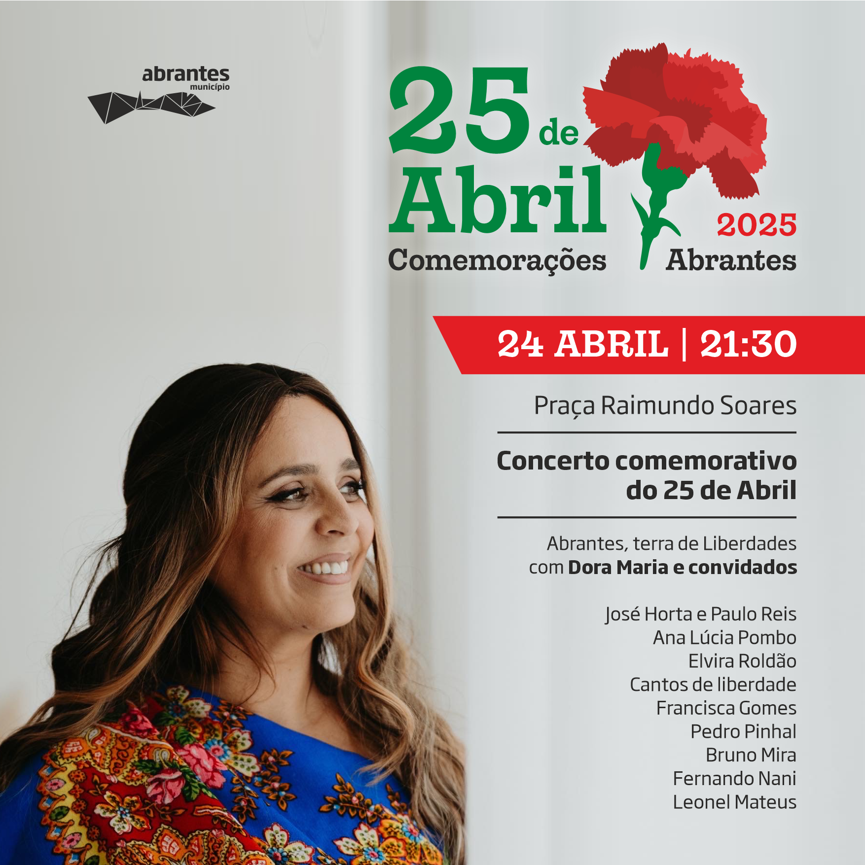 No dia 24 de abril, a Praça Raimundo Soares acolhe o concerto comemorativo do 25 de Abril “Abrantes, terra de Liberdades”, às 21H30, com Dora Maria e convidados: José Horta e Paulo Reis, Ana Lúcia Pombo, Elvira Roldão, Cantos de liberdade, Francisca Gomes, Pedro Pinhal, Bruno Mira, Fernando Nani e Leonel Mateus.