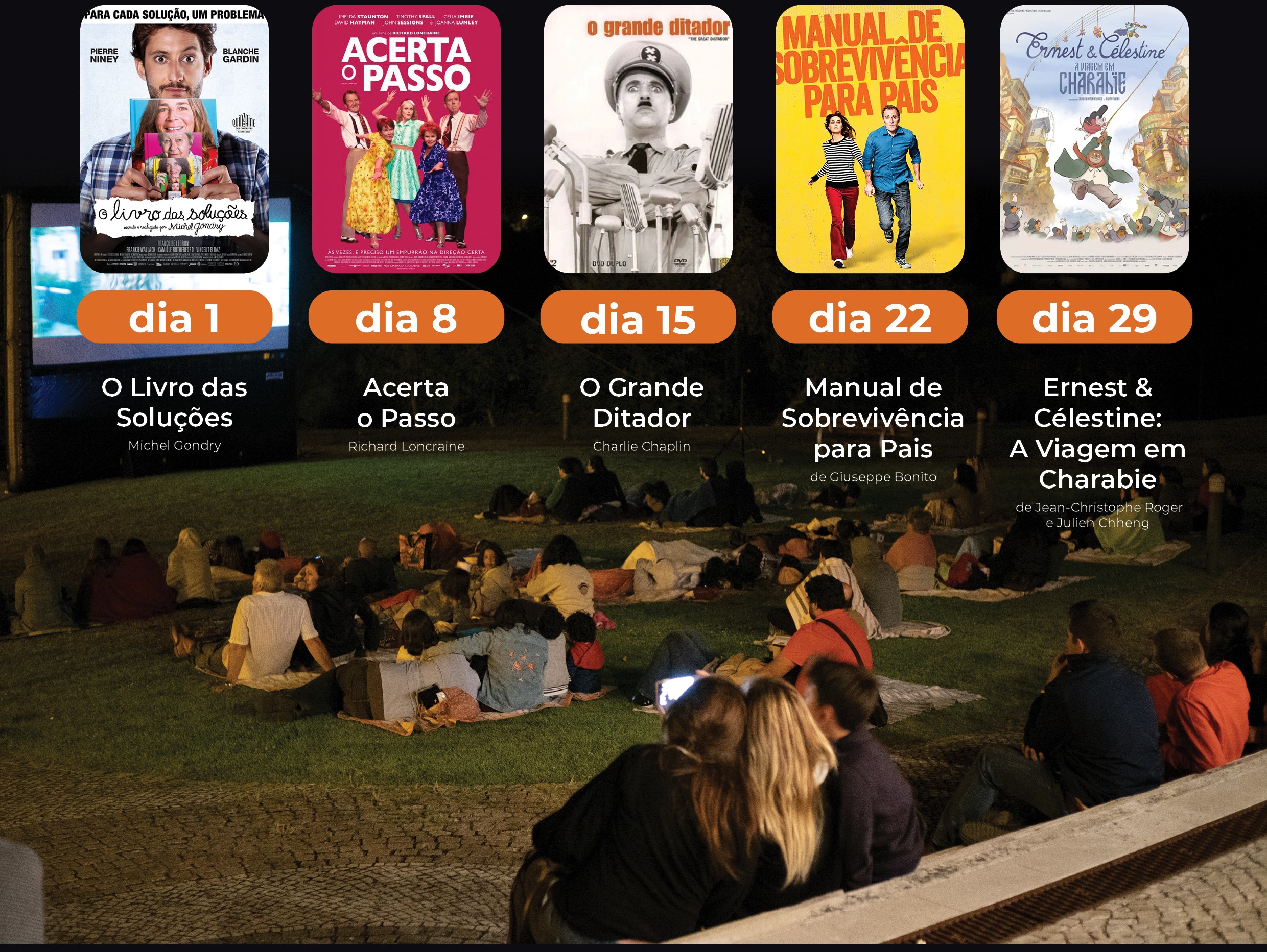 Na tela serão exibidos cinco filmes: “O Livro das Soluções”, no dia 1 de agosto; “Acerta o Passo”, no dia 8; “O Grande Ditador”, no dia 15; “Manual de Sobrevivência para Pais!”, no dia 22, e Ernest & Célestine: A Viagem em Charabie, no dia 29.