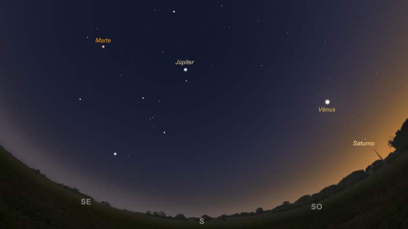 Continua o alinhamento aparente dos planetas no céu, que começou no mês passado. Até ao final de fevereiro ainda será possível ver 4 (ou com muita sorte, 5…) planetas a olho nu, ao anoitecer. Marte parece uma estrela brilhante a Este, com Vénus, a Sudoeste e Júpiter, bem alto no céu a Sul, a parecerem autênticas “superestrelas” no céu. Mais próximo do horizonte, por baixo de Vénus, ainda é possível ver, com dificuldade crescente, o planeta Saturno. De dia para dia este planeta nasce cada vez mais tarde e vai ficando cada vez mais próximo da nossa estrela, por se estar a aproximar do Sol, no céu. No final do mês deixa mesmo de se ver, mas mais ou menos nessa altura, Mercúrio torna-se visível ao anoitecer.