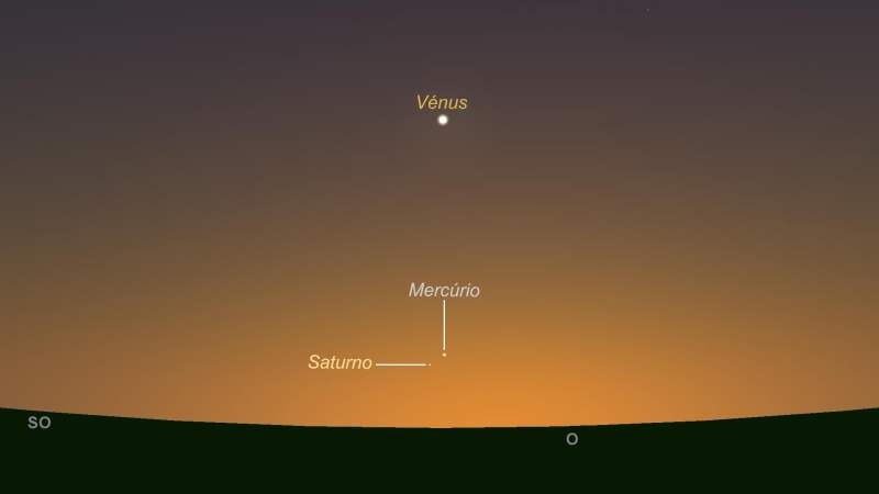 Ora, no dia 25, Mercúrio, que está visível logo ao pôr-do-Sol, está quase colado a Saturno, no céu. Mas Saturno, que está pouco brilhante por se encontrar praticamente do lado oposto do Sol, só se começa a ver por volta das 18:45. A essa hora, os dois planetas já estarão a cerca de 5 graus acima do horizonte, a uma distância de 1,5 graus um do outro. “A olho”, significa que, medidos à distância de um braço estendido, os dois planetas estão cerca de 3 dedos acima do horizonte, e separados de apenas um dedo mindinho.