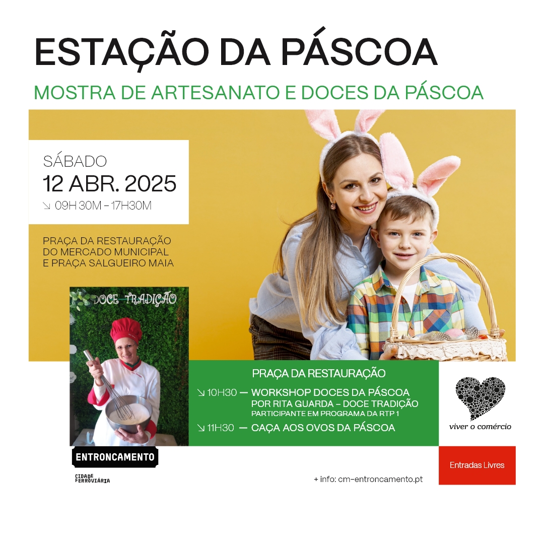 A Praça Salgueiro Maia e a Praça da Restauração do Mercado Municipal, no Entroncamento, recebe no dia 12 de abril, sábado, entre as 9h30m e as 17h30m, a atividade “Viver o Comércio - Estação da Páscoa”.
