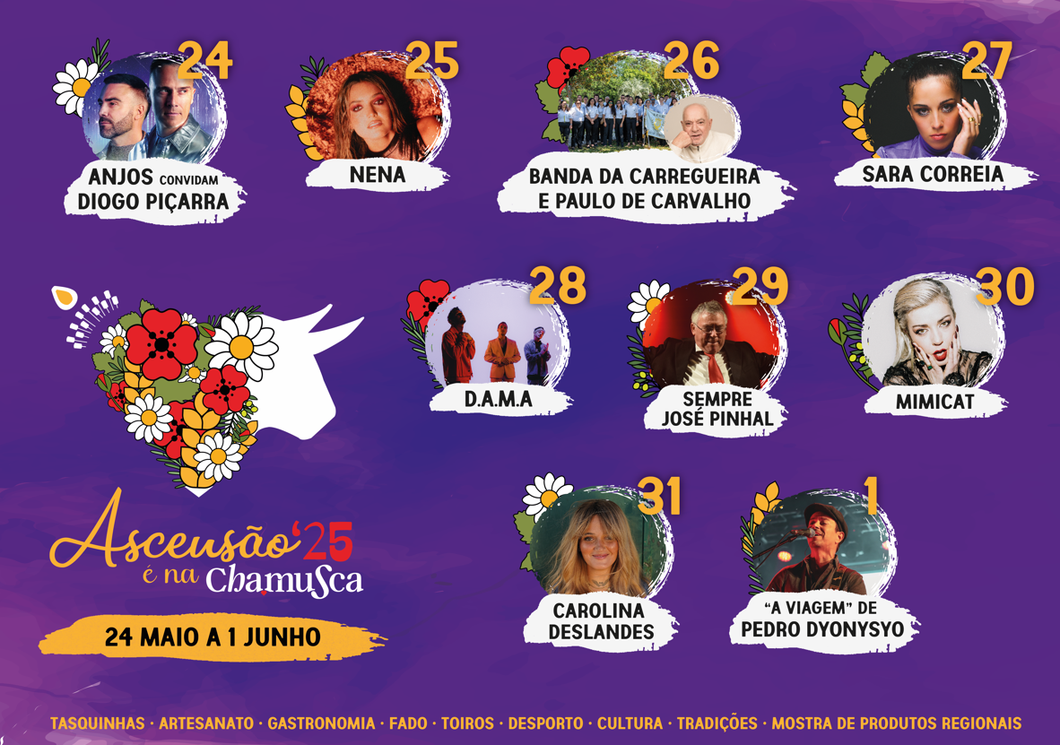 A maior festa do concelho da Chamusca está a chegar. A Semana da Ascensão’25 decorre este ano de 24 de maio a 01 de junho e reúne, como habitualmente, grandes concertos e espetáculos que prometem animar as nove noites da maior semana do concelho da Chamusca.