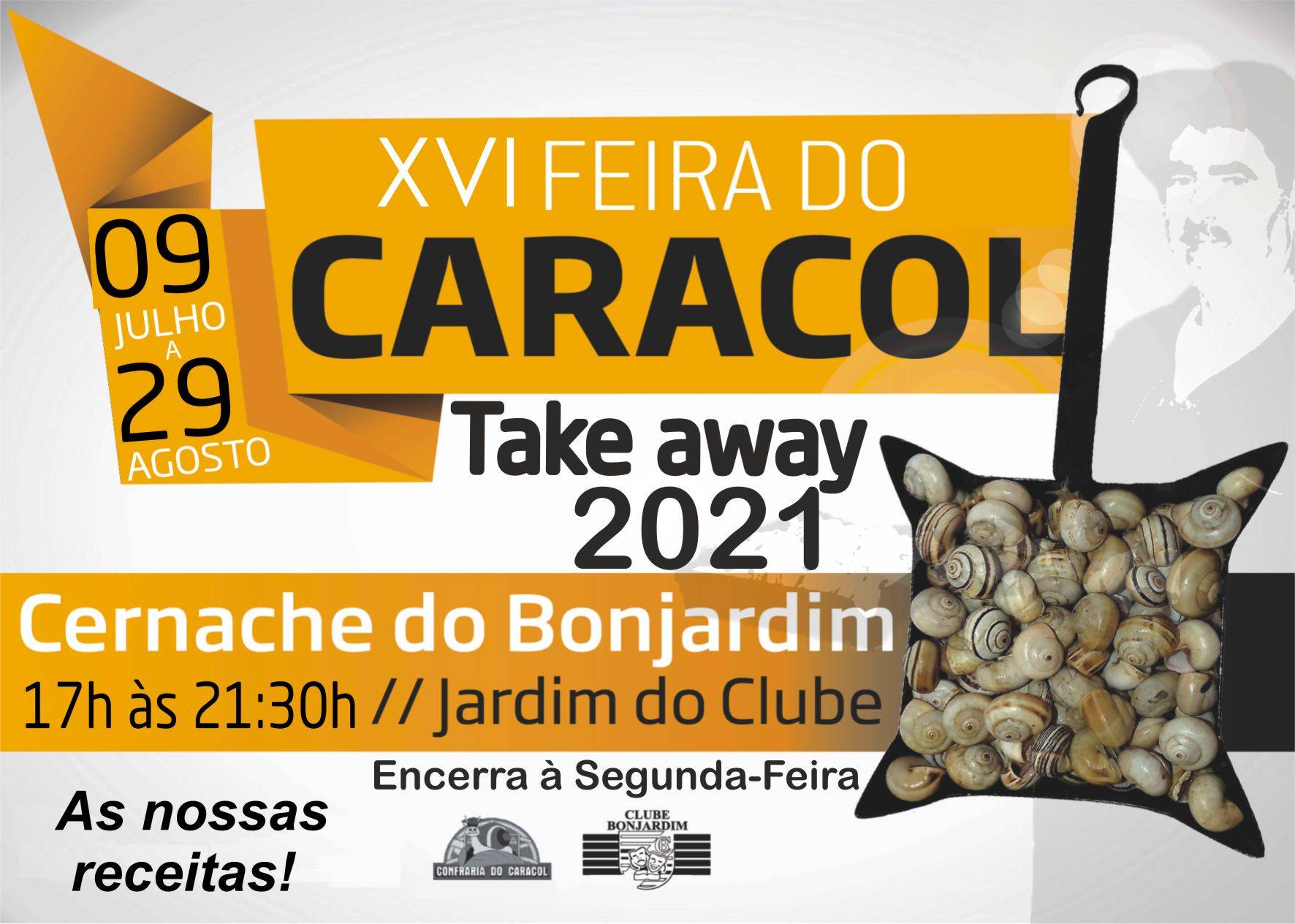 De 9 de julho a 29 de agosto, o Clube Bonjardim, em Cernache do Bonjardim, promove a 16.ª edição da Feira do Caracol em regime de take away. “Comer caracóis com o ensinamento do Mestre” é o mote da iniciativa que possibilita degustar onze receitas diferentes desta especialidade: Caracol frito, Caracol à Pescador, Caracol com Caril, Caracol à S. Nuno, Omelete de Caracol, Feijoada de Caracol, Escargot, Caracoleta Grelhada na Chapa, Caracol tradicional, Caracol à Caçador e Caracol à Criança.