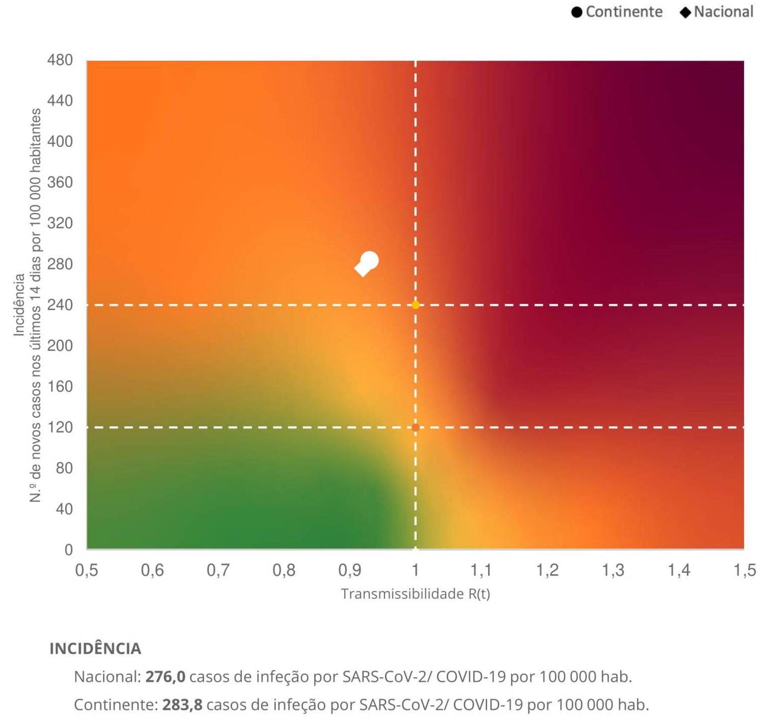 O nível de risco na matriz de monitorização da pandemia de covid-19 fixa-se em 480 casos por 100 mil habitantes a 14 dias.