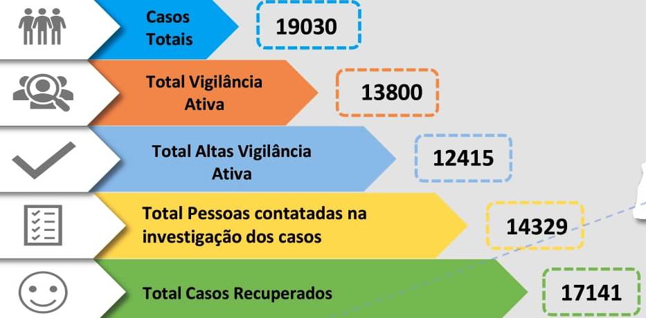 O total de infetados, desde o início da pandemia, ultrapassou a barreira dos 19 mil desde que começou a pandemia. Há registo de 19 030 casos de pessoas que testaram positivo ao vírus que provoca a Covid-19.