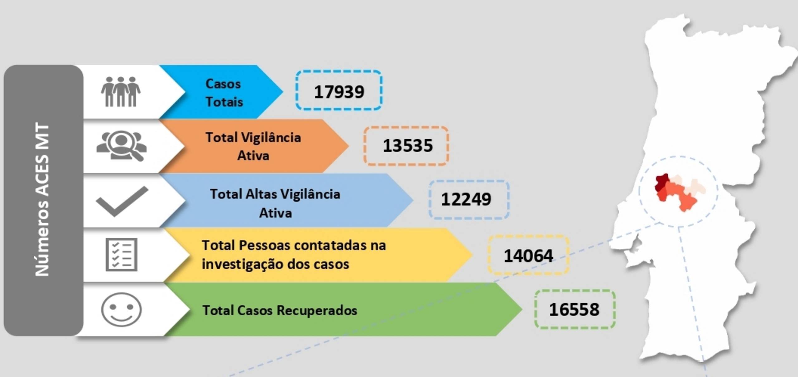 A Unidade de Saúde Pública do Médio Tejo (USPMT) registou nesta sexta-feira, dia 3 de dezembro, mais 55 pessoas infetadas com SARS-COV-2 e tem um total de casos acumulados, desde o início da pandemia, de 17 939. Os 55 casos anotados pelos laboratórios nesta região foram registados em Abrantes (6), Entroncamento (3), Ourém (25), Sardoal (1), Tomar (11) e Torres Novas (9). Alcanena, Constância, Ferreira do Zêzere, Mação e Vila Nova da Barquinha não registaram qualquer caso de infeção nas últimas 24 horas.
