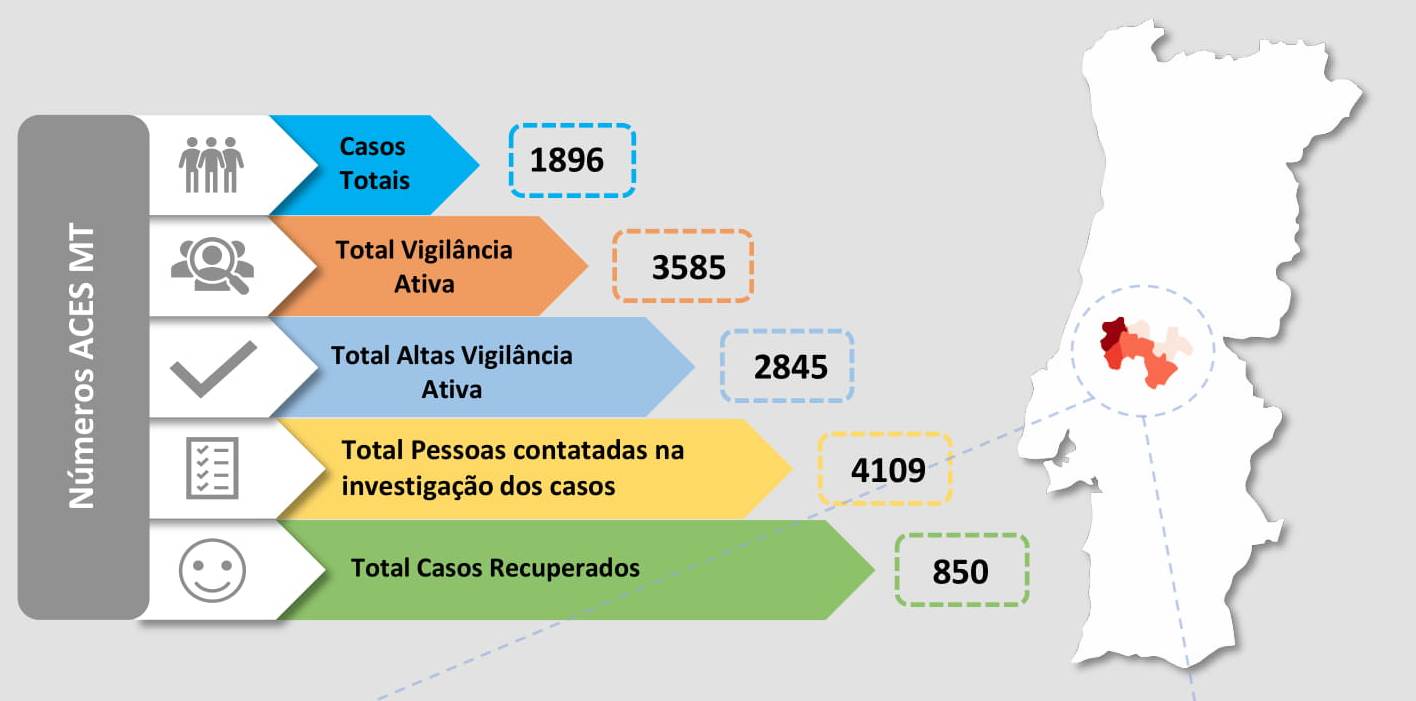 No que diz respeito a vigilâncias ativas a Unidade de Saúde Pública do Agrupamento de Centros de Saúde do Médio Tejo aponta 793 pessoas que estão em confinamento. Estas pessoas têm o dever de ficar em isolamento porque foram contactos diretos de infetados com o SARS-Cov-2. As vigilâncias ativas estão distribuídas por Abrantes (127), Alcanena (38), Constância (44) Entroncamento (93), Ferreira do Zêzere (18), Mação (27), Ourém (164), Sardoal (29), Tomar (131), Torres Novas (99) e Vila Nova da Barquinha (23).