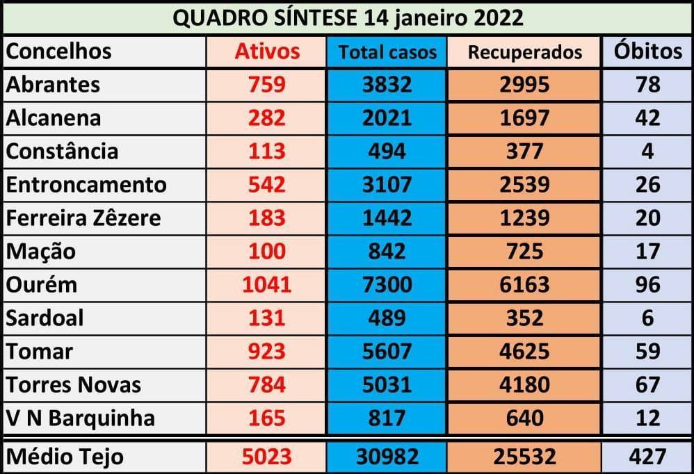 Já o que diz respeito aos novos contágios a Unidade de Saúde Pública do Médio Tejo (USPMT) dá conta de mais 758 novos casos registados pelos laboratórios. O total de casos acumulados é nesta sexta-feira, dia 14 de janeiro, de 30.982.
