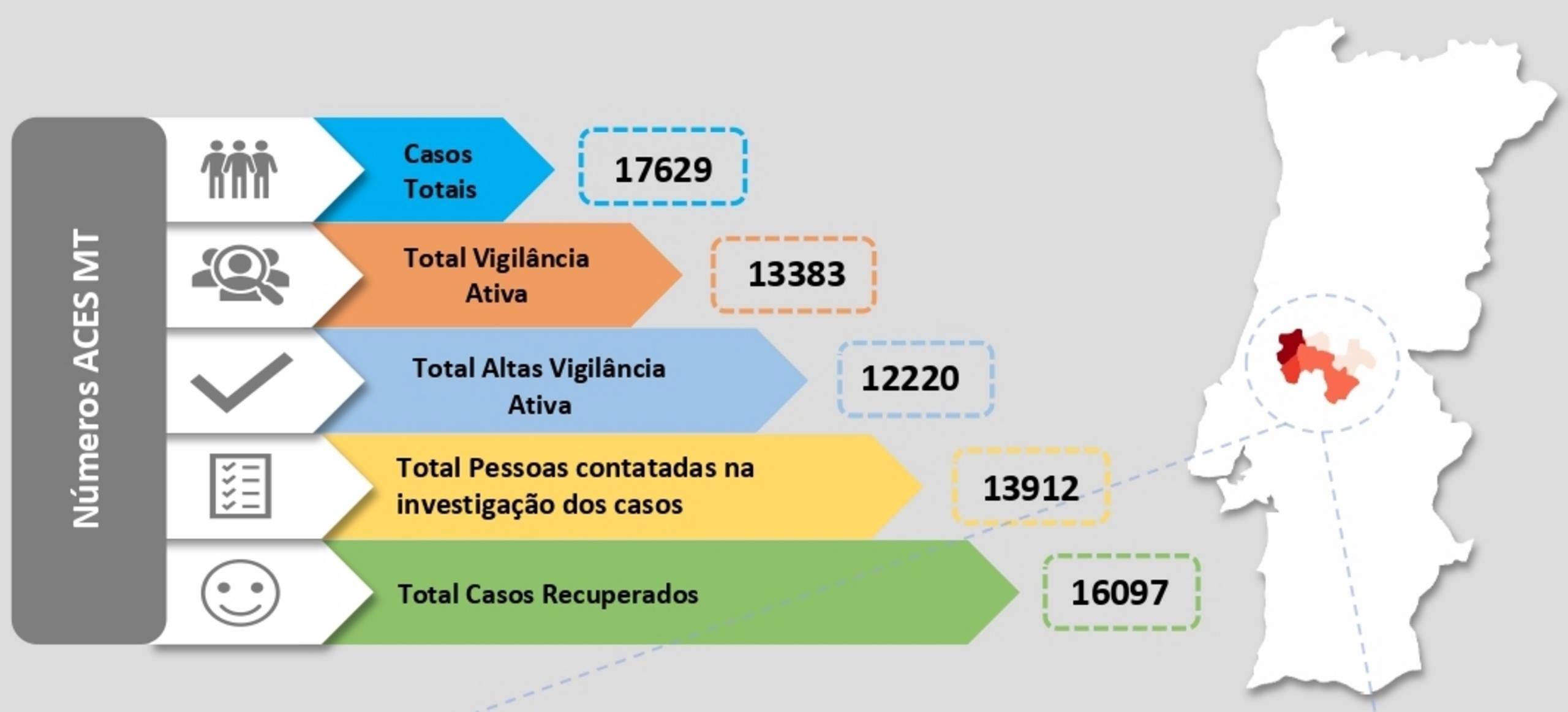 Com a atualização de todos estes dados, o número de casos ativos no Médio Tejo é de 1 120 pessoas com SARS-COV-2 localizadas em Abrantes (141), Alcanena (41), Constância (26), Entroncamento (157), Ferreira do Zêzere (37), Mação (7), Ourém (260), Sardoal (5), Tomar (136), Torres Novas (257) e Vila Nova da Barquinha (53).