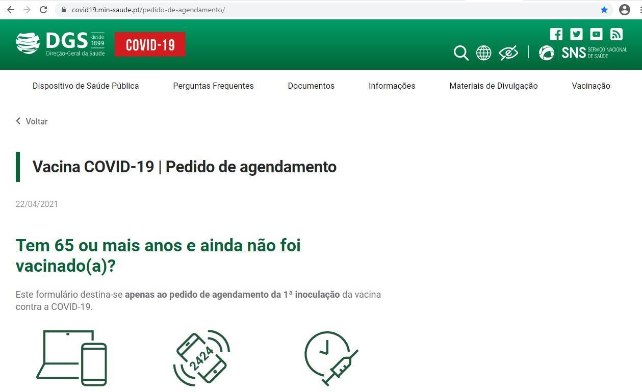 Os Serviços Partilhados do Ministério da Saúde (SPMS) adiantam em comunicado que esta funcionalidade está acessível a partir do Portal da Covid-19 (covid19.min-saude.pt/pedido-de-agendamento) e permite que os utentes com mais de 65 anos, faixa etária que começará agora a ser vacinada independentemente de qualquer doença, possam escolher o ponto de vacinação em que pretendem ser vacinados.