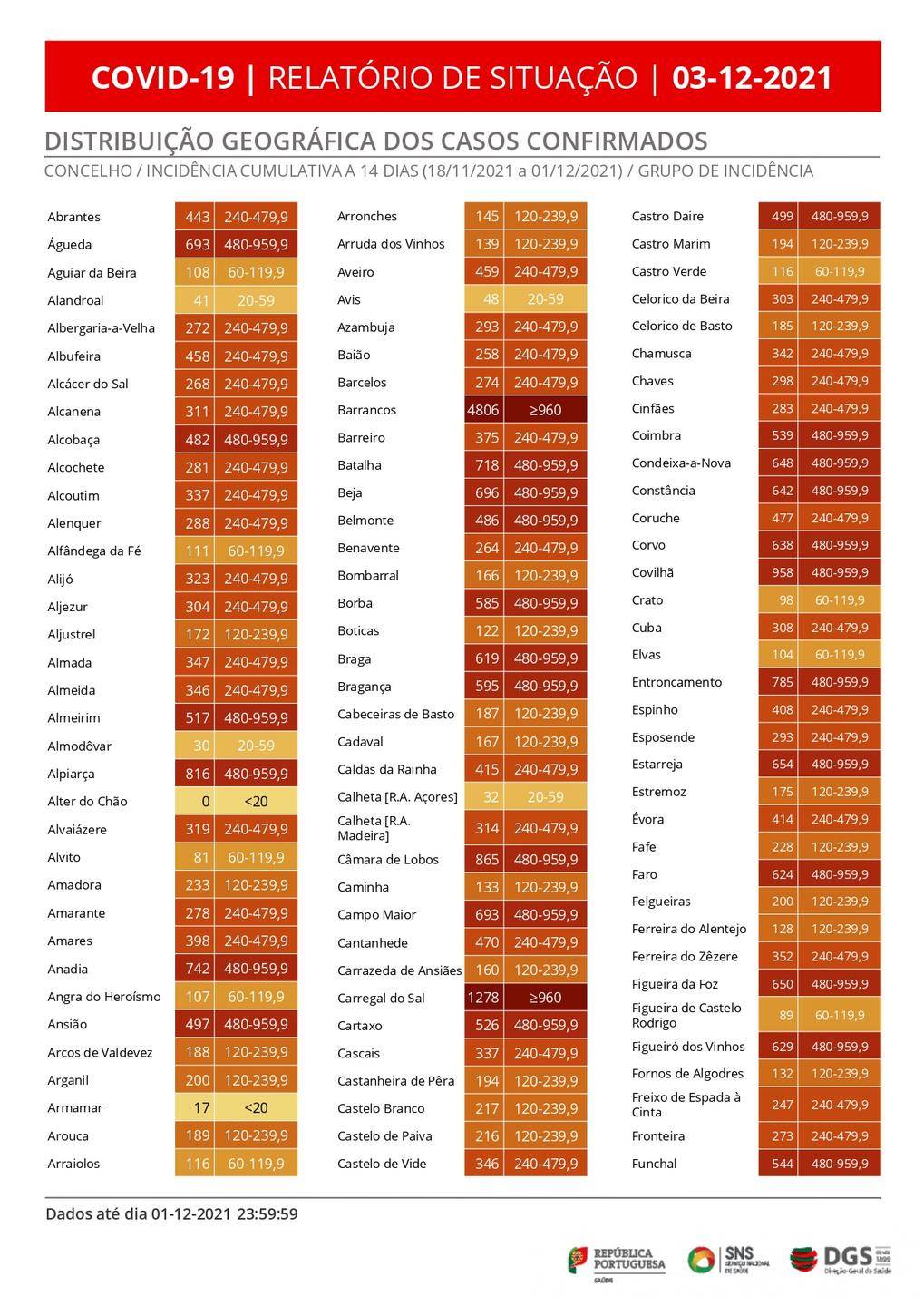 Na nota explicativa dos dados por concelhos é referido que a incidência cumulativa "corresponde ao quociente entre o número de novos casos confirmados nos 14 dias anteriores ao momento de análise e a população residente estimada".