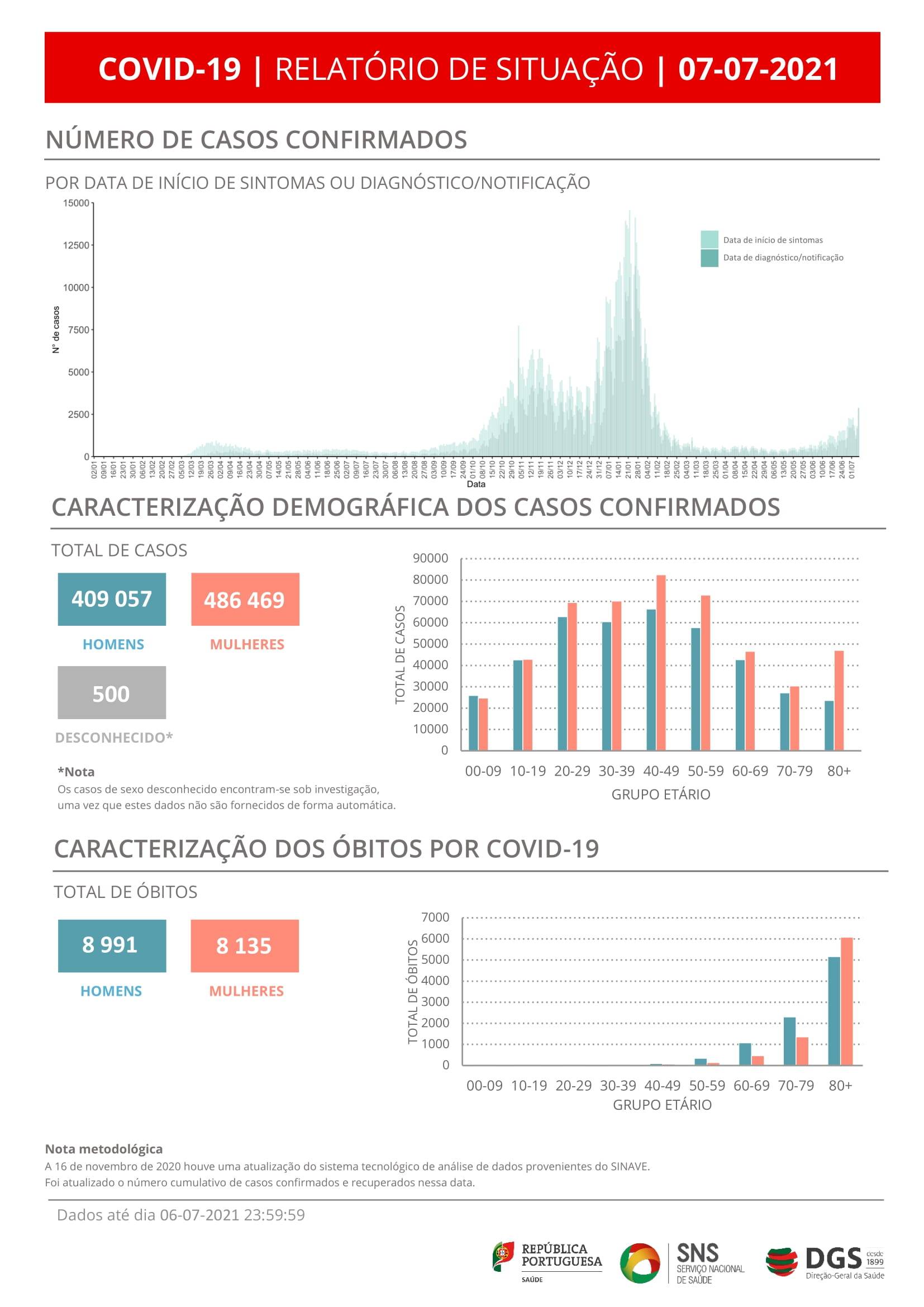 Quanto às infeções o boletim revela que do total de 896.026 pessoas infetadas desde o início da pandemia, 50.627 tinham entre os 0 e os 9 anos, 85.454 entre os 10 e os 19 anos, 132.294 entre os 20 e os 29 anos, 130.543 entre os 30 e os 39 anos, 148.821 entre os 40 e os 49 anos, 130.551 entre os 50 e os 59 anos, 89.209 entre os 60 e os 69 anos, 57.446 entre os 70 e os 79 anos e 70.581 com mais de 80 anos.