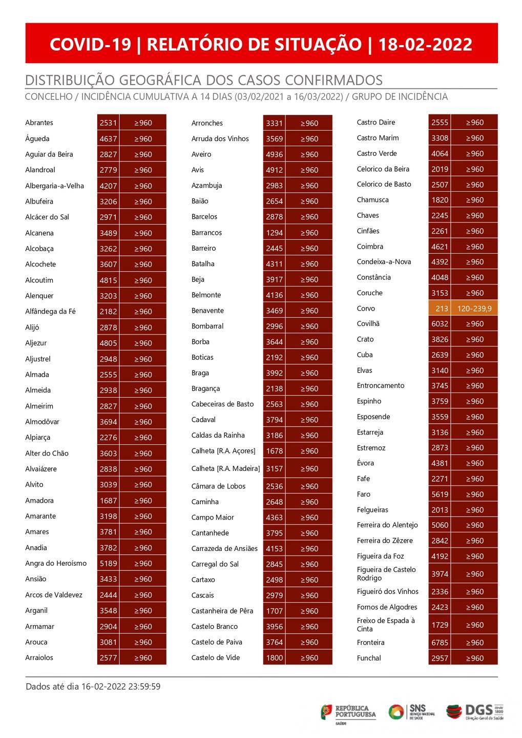 Entre os restantes 306 concelhos com incidência mais alta destacam-se Santa Cruz da Graciosa (8.064), Lagoa (7.159), Fronteira (6.785), Ponta Delgada (6.989) e Monforte (6.785), todos eles com valores inferiores aos máximos da sexta-feira passada.