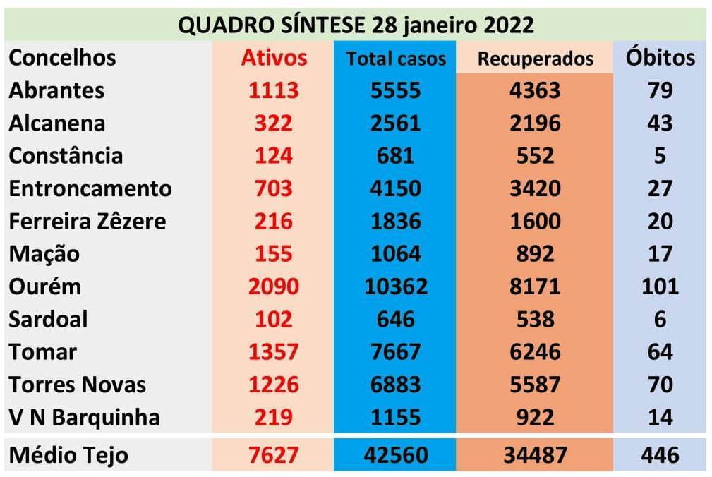 O número de casos ativos no território dos 11 concelhos da saúde do Médio Tejo foi atualizado para 7.627. Estes casos estão localizados em Abrantes (1.113), Alcanena (322), Constância (124), Entroncamento (703), Ferreira do Zêzere (216), Mação (155), Ourém (2.090), Sardoal (102), Tomar (1.357), Torres Novas (1.226) e Vila Nova da Barquinha (219).