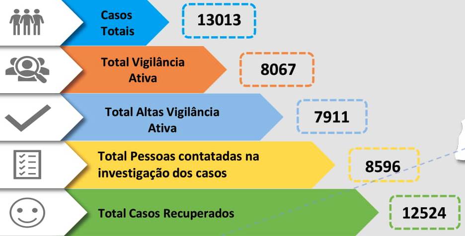 No que diz respeito ao número de recuperados não há alteração em relação ao dia anterior (12 524), assim como o número de óbitos (378) continua inalterado.