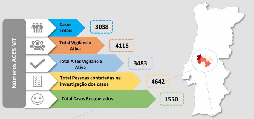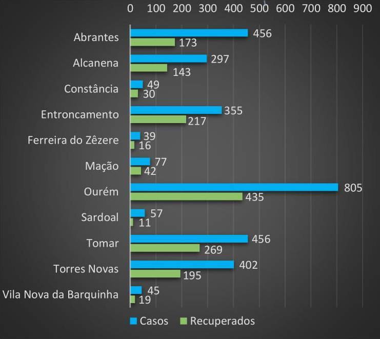De acordo com o relatório epidemiológico da Unidade de Saúde Pública do Agrupamento de Centros de Saúde do Médio Tejo os 84 casos desta segunda-feira estão registados em Abrantes (12), Mação (1), Ourém (41), Sardoal (1), Tomar (13) e Torres Novas (16).