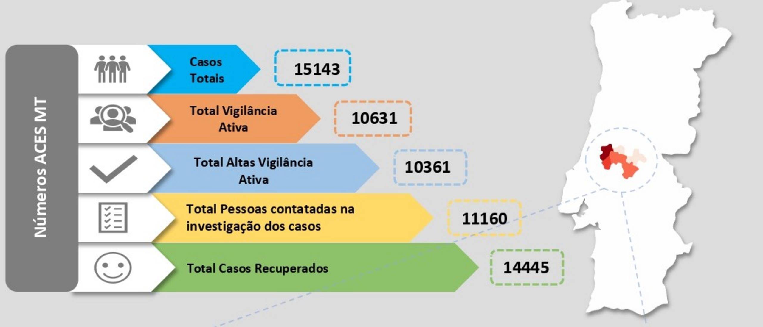 Com esta atualização, o número de casos ativos no Médio Tejo passou a ser de 303 e estão localizados em Abrantes (37), Alcanena (17), Constância (2), Entroncamento (44), Ferreira do Zêzere (16), Mação (5), Ourém (73), Sardoal (1), Tomar (75), Torres Novas (29) e Vila Nova da Barquinha (4).