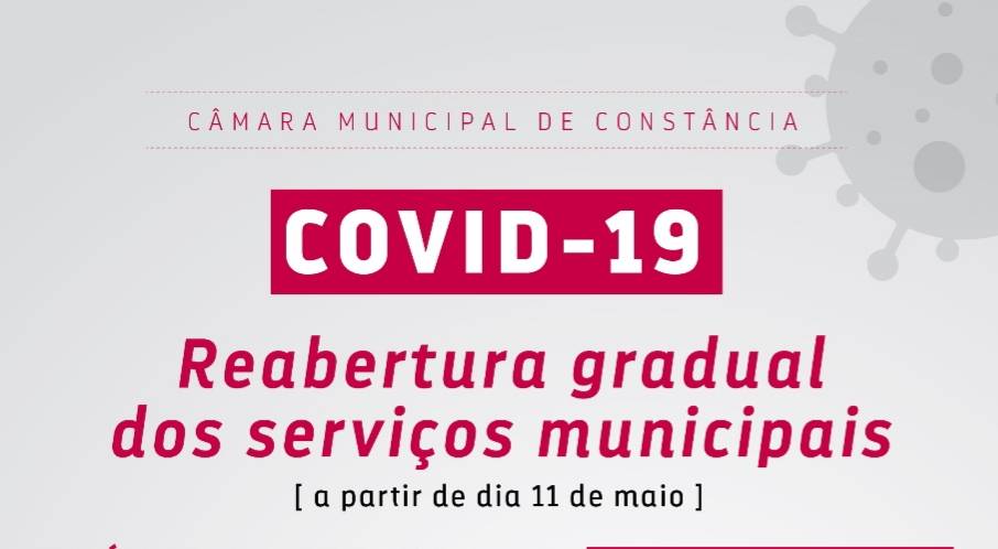 A partir da próxima segunda-feira, 11 de maio, o Município de Constância vai proceder a uma reabertura gradual dos serviços, integrada na estratégia de levantamento de confinamento no âmbito do combate à propagação da doença COVID 19, prevista nas Resoluções do Conselho de Ministros n.º 33-A/2020 e 33-C/2020, de 30 de abril, e Decreto-Lei n.º 20/2020, de 1 de maio.
