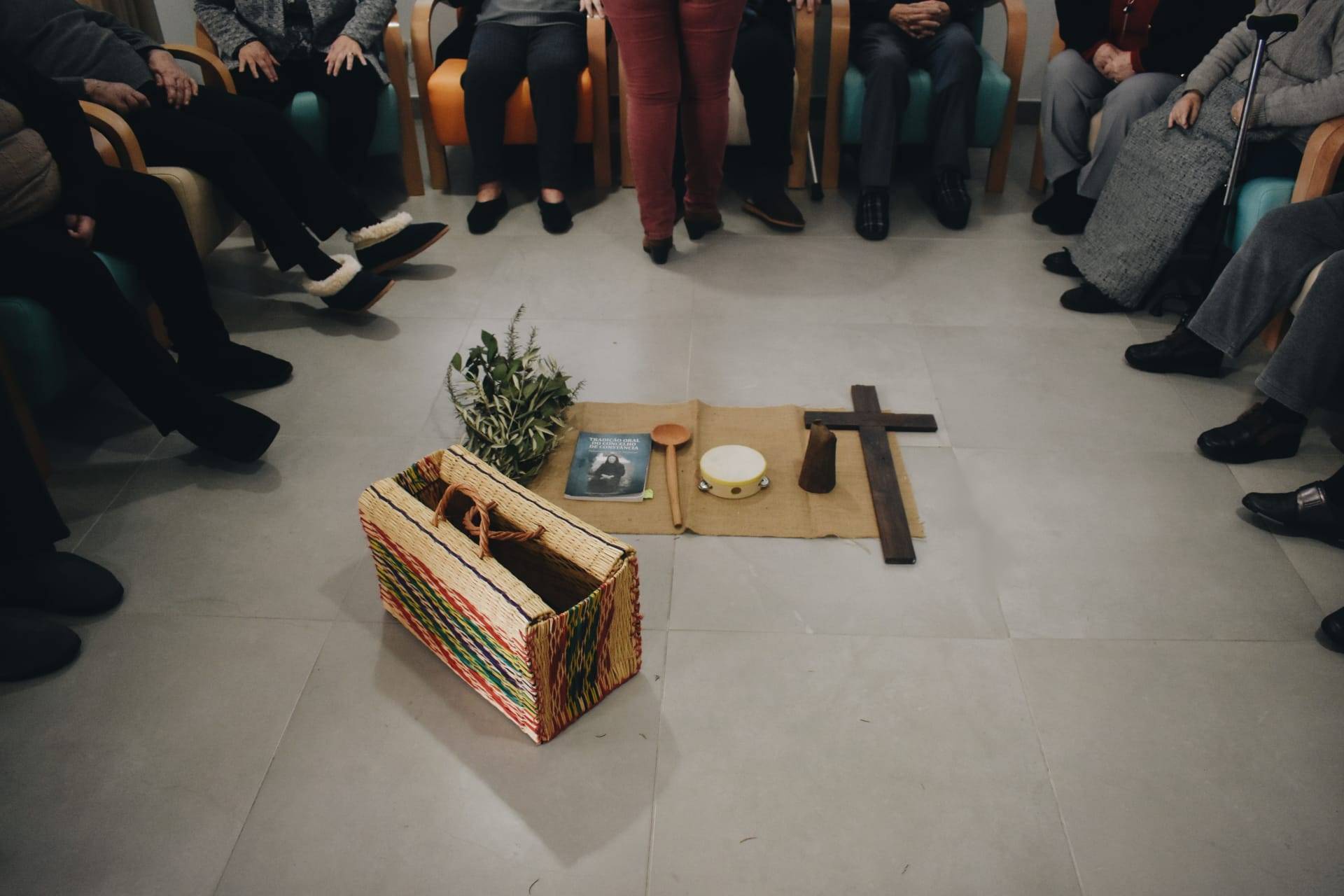 À nossa espera estava um grupo de idosos sentados em redor de uma toalha de memórias: um crucifixo, uma colher de pau, uma pandeireta, um chocalho, uma cesta de piquenique e também um ramo composto de folhas de oliveira, rosmaninho, louro e outras plantas que aromatizavam o ar.