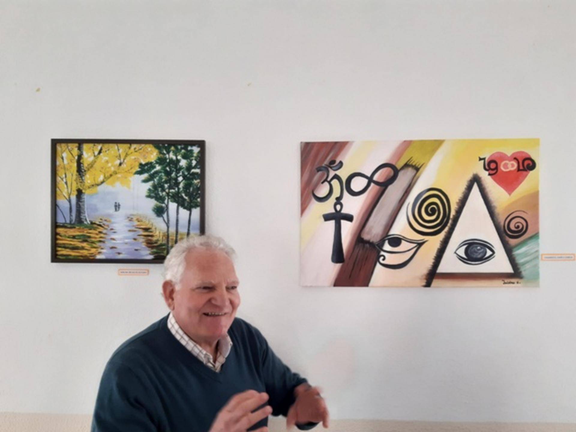 Logo na primeira aula, o professor não acreditava que nunca tinha pintado. Agora já fez um percurso. Começou pela paisagem, saturou-se. Quis mais. “Gosto de desafios”, diz. Agora pinta quadros que ele próprio concebe, de intenso condensado simbólico, por vezes de claro tom surrealista.