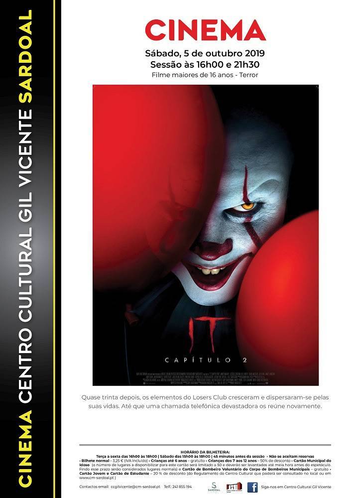Este sábado, dia 5 de outubro, o Centro Cultural Gil Vicente, em Sardoal, vai acolher duas sessões de cinema cujo protagonista é o filme de terror "It:Capítulo 2".