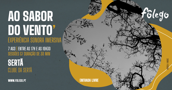 Em “Ao Sabor do Vento”, o compositor Hugo Vasco Reis parte da recolha de sons para a criação de cinco obras baseadas em paisagens sonoras associadas a cada um dos municípios do território do FÔLEGO: Sertã, Oleiros, Mação, Proença-a-Nova e Vila de Rei. Cada um destes municípios receberá uma sessão única, com uma paisagem sonora única, que o público poderá descobrir. Como em todas as iniciativas do FÔLEGO, a entrada é livre.