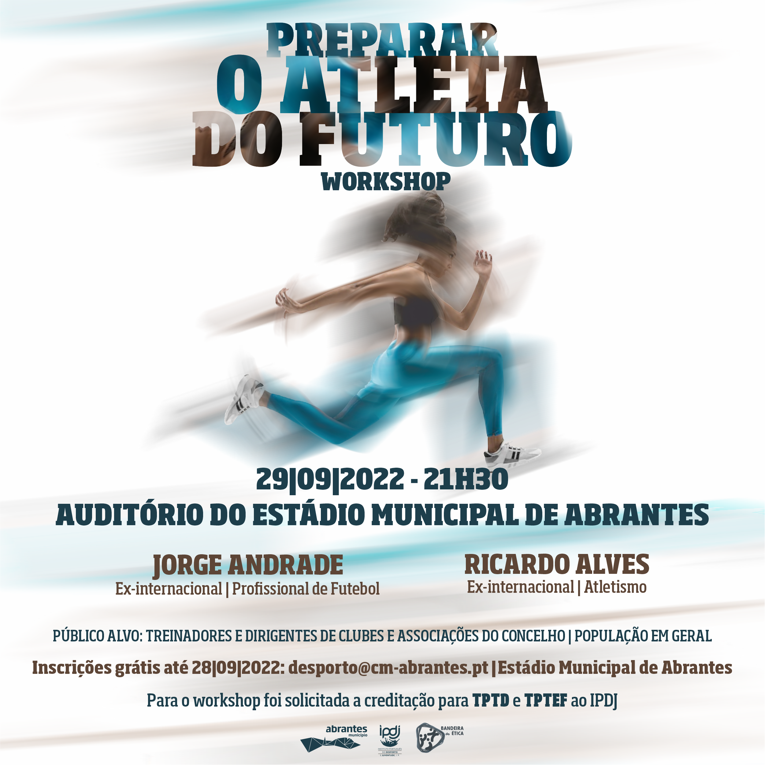 A 20ª edição do workshop “Preparar o atleta do futuro”, evento com periodicidade bianual, organizado pelo Município de Abrantes desde 2011, volta a realizar-se no próximo dia 29 de setembro e contará com as presenças do ex-futebolista Jorge Andrade que representou, entre outros, o Futebol Clube do Porto e a Juventus F.C., e de Ricardo Alves, que se destacou como um dos melhores velocistas nacionais, ao serviço do Tramagal Sport União e Sporting Clube de Portugal.
