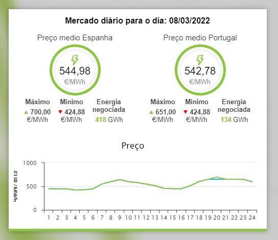 Por faixas horárias, o preço mais alto será registado entre as 18:00 e as 19:00 (mais uma hora me Espanha), atingindo os 700 euros/MWh, ao passo que o mínimo será de 424,88 euros/MWh entre as 02:00 e as 03:00.