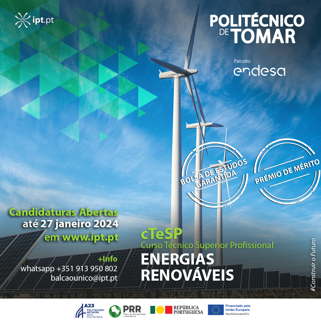 O prazo de candidaturas para o novo curso Técnico Superior Profissional (cTeSP) em Energias Renováveis do Politécnico de Tomar (IPT) foi prolongado até ao próximo dia 27 de janeiro. Os interessados devem submeter a sua candidatura através do portal IPT em https://portal2.ipt.pt/pt/candidaturas/.