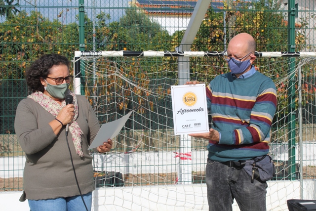 Carlos Toco Bento explica que a horta e o pomar foram desenhados neste sentido de cada turma ganhar o sentimento de posse do seu espaço, do seu trabalho. E quando souberam do projeto da CAP resolveram apresentar a candidatura, agora aprovada. Mas para além de um galardão a CAP trouxe também à Chainça uma mão-cheia de sacos de fertilizante biológico, ancinhos e sachos em formato mini para as crianças poderem “trabalhar” a terra e uma cerejeira.