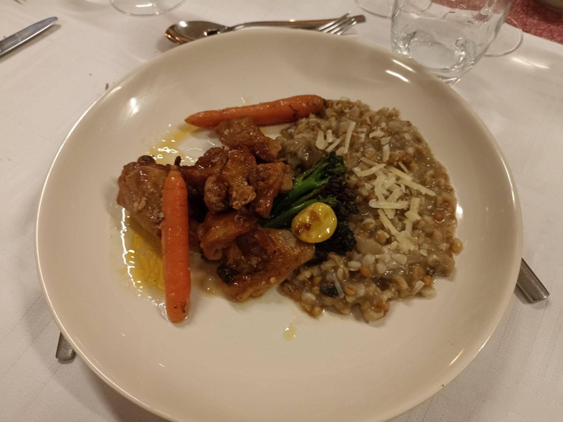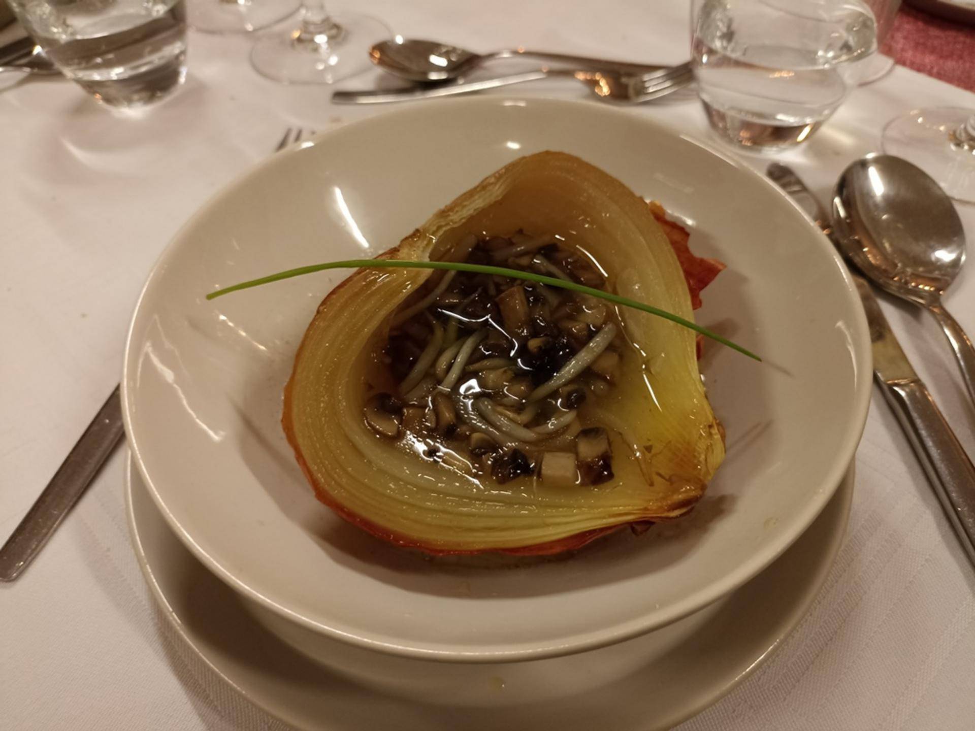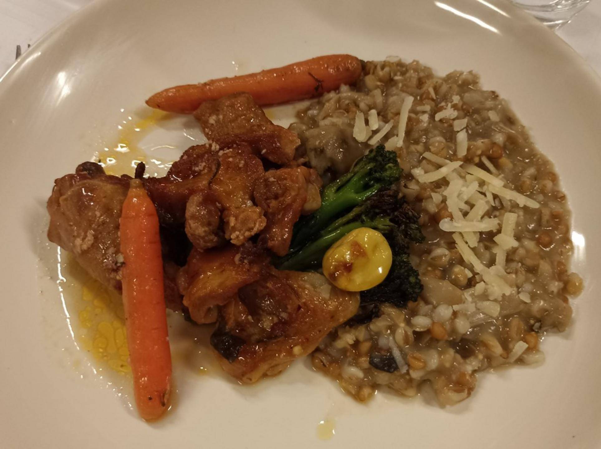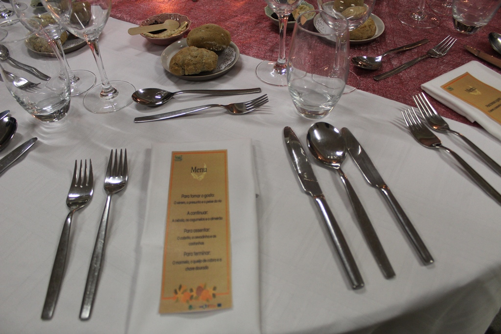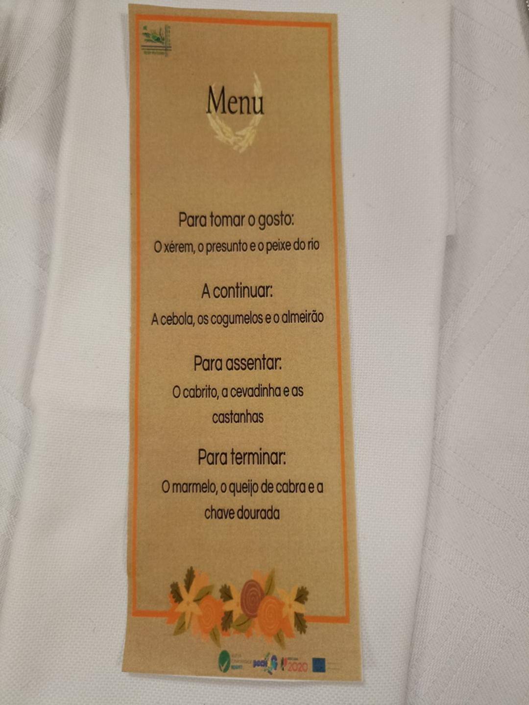 Para entrada o xérem com presunto e peixe do rio, depois foi apresentado um caldo com cogumelos e almeirão. O prato de cabrito com risoto de cevadinha e castanhas e para fechar um mil folhas de marmelo com queijo de cabra e a Chave Dourada.