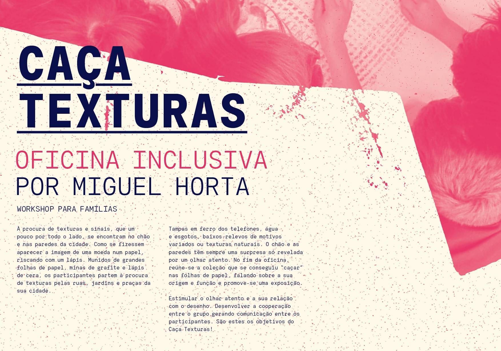 “Caça Texturas” é o nome desta iniciativa dinamizada por Miguel Horta, dirigida a todas as idades, que tem como objetivo estimular o olhar atento e a sua relação com o desenho. Esta ação levará os participantes, munidos de grandes folhas de papel, minas de grafite e lápis de cera, à procura de texturas pelas ruas, jardins e praças da cidade de Abrantes.