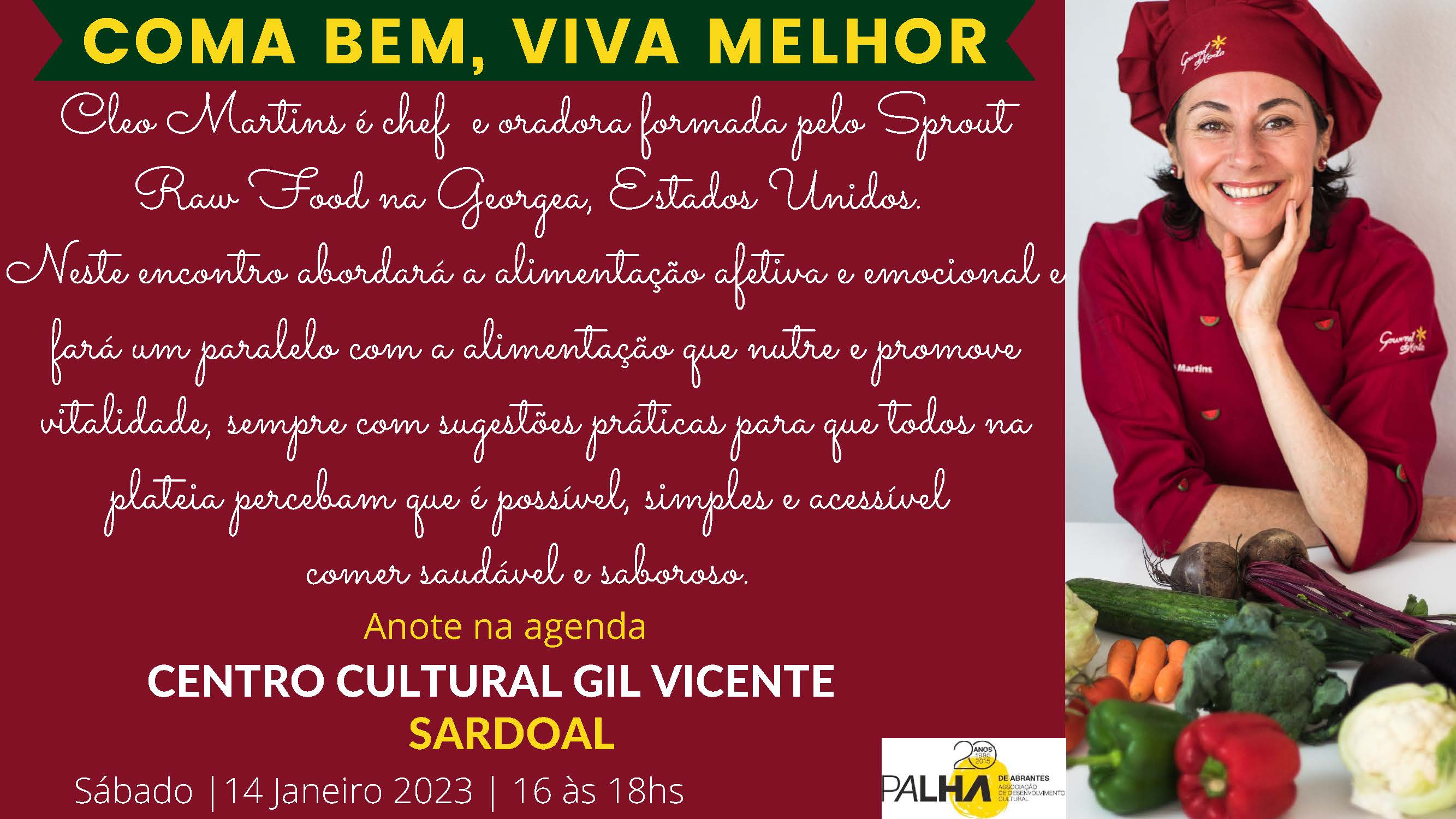 O Centro Cultural Gil Vicente, em Sardoal, recebe no sábado, dia 14 de janeiro, entre as 16 e as 18 horas, uma sessão subordinada ao tema “Coma Bem, Viva Melhor” pela Chef Cleo Martins.