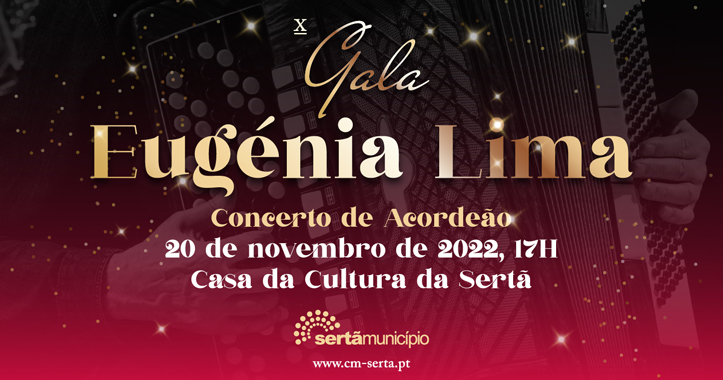 A Gala Eugénia Lima está de regresso à Casa da Cultura da Sertã, no dia 20 de novembro, às 17 horas. Trata-se da décima edição deste espetáculo de acordeão, promovido pelo Município da Sertã, com o objetivo de homenagear a acordeonista Eugénia Lima e promover o acordeão, instrumento típico da Música Popular Portuguesa. A décima edição marca o regresso desta iniciativa, após o interregno motivado pela pandemia.