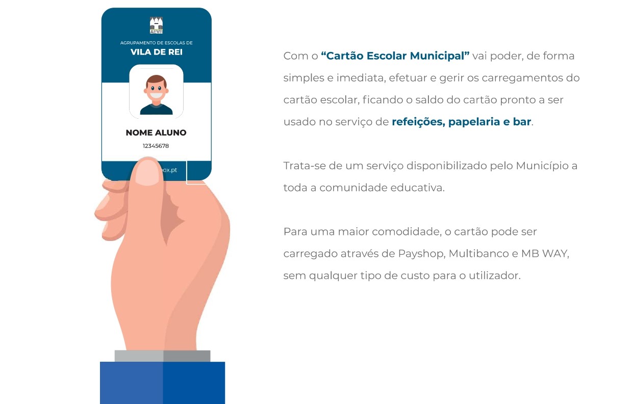 Para que os Encarregados de Educação possam proceder ao pagamento das refeições dos alunos, o Município implementou o Cartão Escolar Municipal Pré-Pago, de forma a que seja possível carregar e gerir o saldo disponível para os alunos utilizarem no serviço de refeições, papelaria e bar.