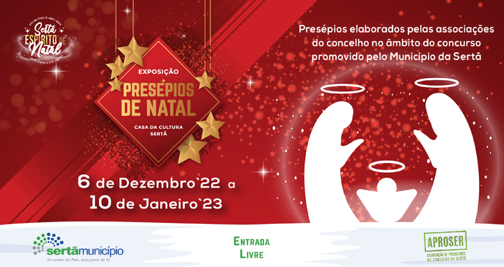 Até 10 de janeiro de 2023, a Casa da Cultura da Sertã tem patente ao público a exposição de 11 presépios elaborados no âmbito do concurso “Presépios de Natal 2022”. Diversas associações recreativas, culturais e desportivas do concelho da Sertã aceitaram o desafio e deram largas à imaginação, realizando as suas criações e interpretações das figuras centrais do presépio, que podem agora ser apreciadas.