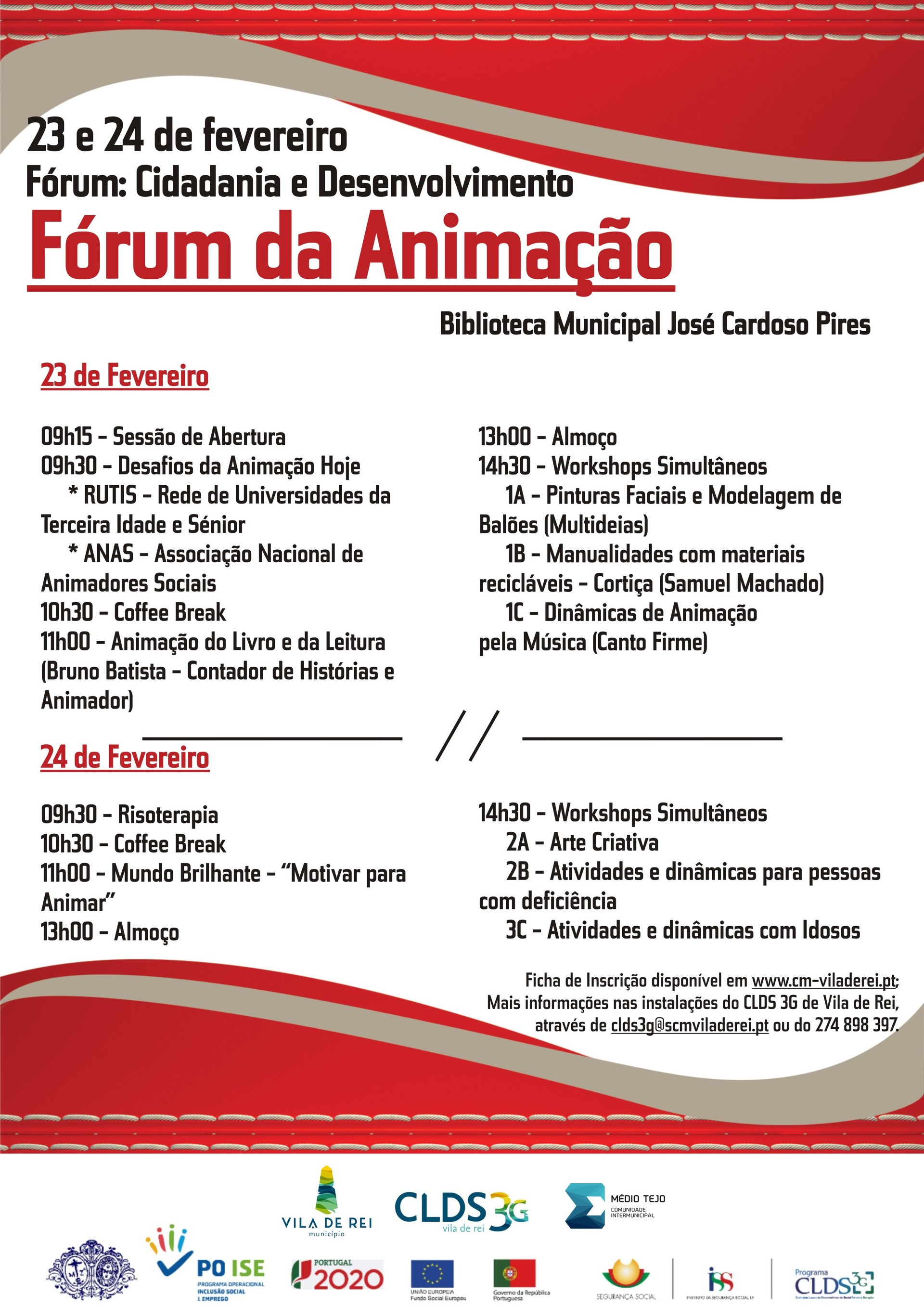 A iniciativa, organizada pela equipa do CLDS 3G de Vila de Rei em parceria com o Município, vai reunir um conjunto de técnicos especializados na área da Saúde que abordarão temáticas como “Desafios da Animação hoje”, “Animação do Livro e da Leitura”, “Risoterapia” e “Motivar para Animar”. Em cada um dos dias desta ação, os participantes irão ainda optar por um dos workshops a decorrer: “Pinturas Faciais e Modelagem de Balões”, “Manualidades com Materiais Recicláveis” e Dinâmicas de Animação pela Música”, a 23 de fevereiro; “Arte Criativa”, “Atividades e dinâmicas para pessoas com deficiência” e “Atividades e dinâmicas com Idosos”, a 24 de fevereiro.
