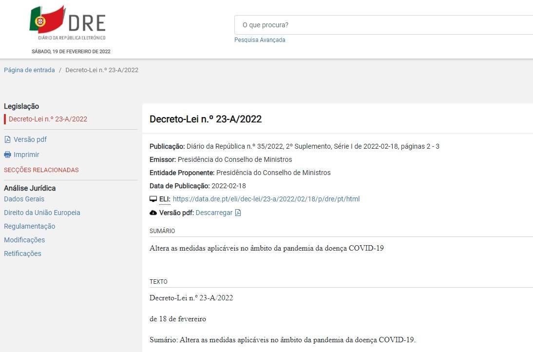 O decreto-lei que altera e simplifica as medidas no âmbito da pandemia de covid-19, incluindo fim da recomendação do teletrabalho e do confinamento de pessoas consideradas contactos de risco de infetados, foi publicado na sexta-feira em Diário da República.