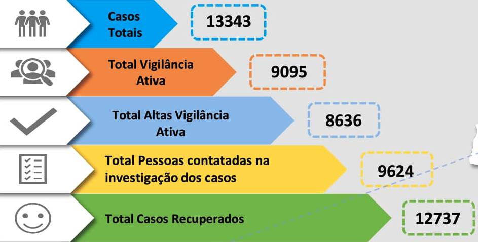 O número de pessoas recuperadas é de 12 737, mantendo-se os óbitos em 379, pelo que o número de casos ativos é nesta segunda-feira de 227.