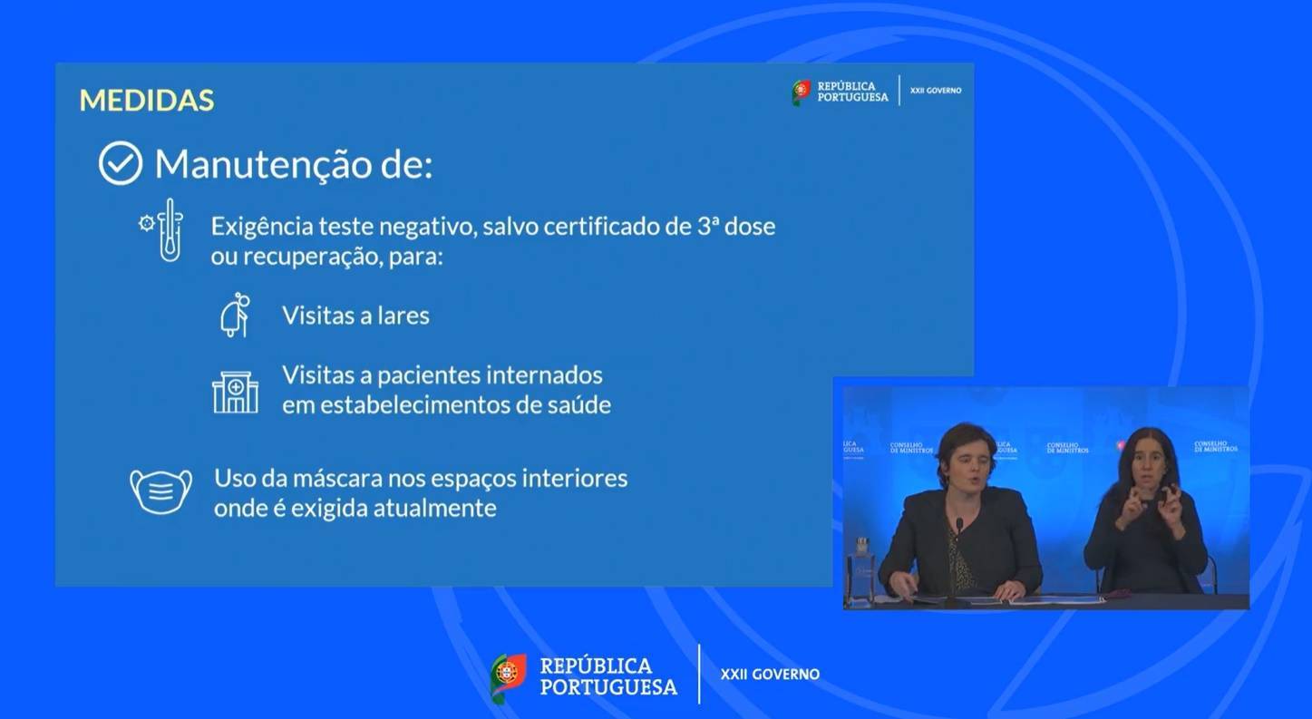 "Nesta primeira fase, mantém-se a exigência de teste negativo, salvo certificado de 3.ª dose ou de recuperação, para visitas a lares e para visitas a pacientes internados em estabelecimentos de saúde", explicou a ministra, referindo que se trata de pessoas "em especial vulnerabilidade".