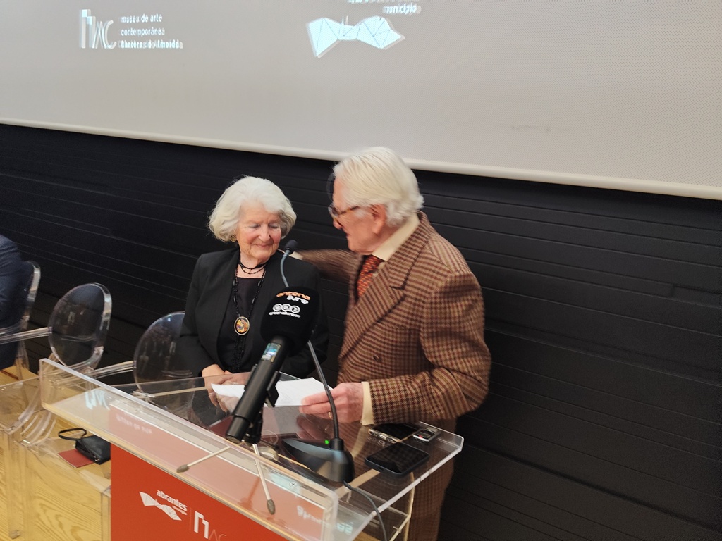 João Charters de Almeida, a mulher, Dona Mariazinha, Manuel Jorge Valamatos, presidente da Câmara de Abrantes, e Isabel Damasceno, presidente da CCDR Centro, descerraram a placa que marca o arranque do Museu de Arte Contemporânea Charters de Almeida. Fica à entrada, do Museu e não na entrada principal do edifício, antes da receção ou loja do Museu.