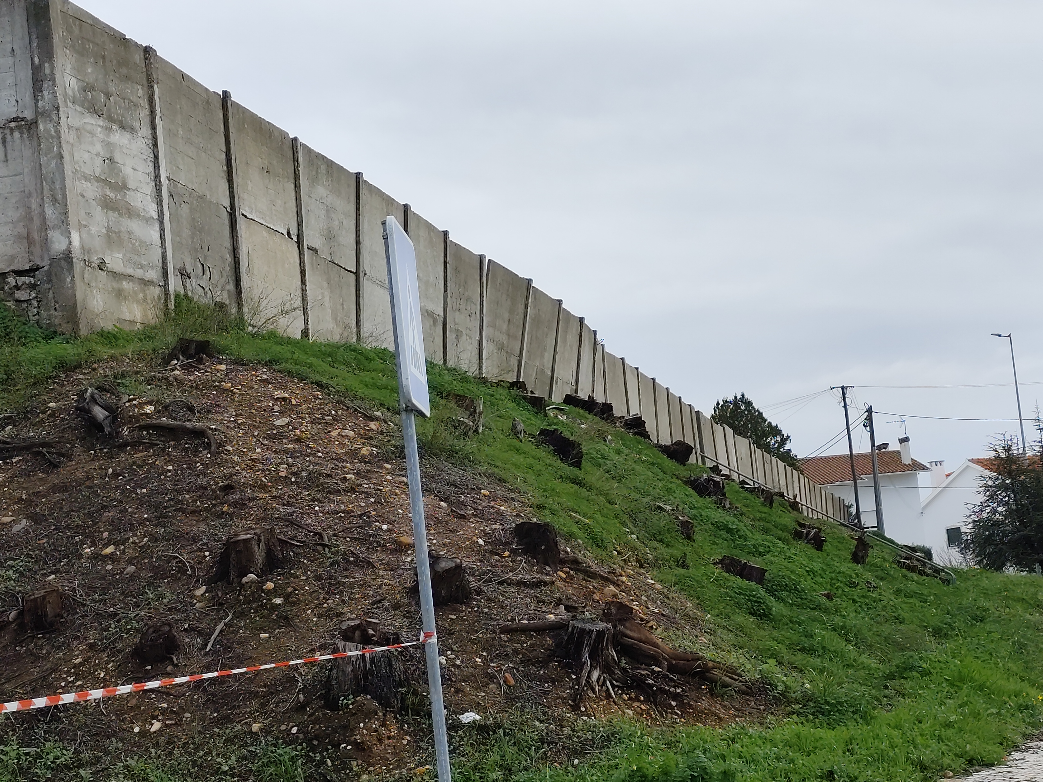 Há cerca de um mês, na lateral do antigo campo, um conjunto destes painéis de cimento (visíveis na fotografia) tombaram mesmo, levando o Município a interditar o acesso aquela via e o encerramento dos lugares de estacionamento em causa.