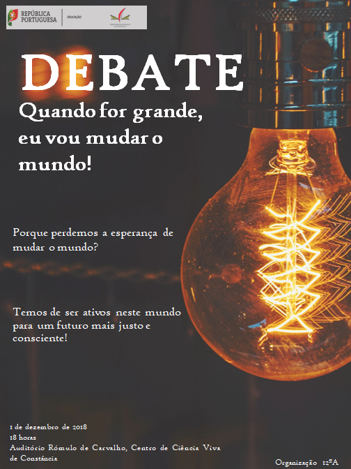 Este sábado, às 18h00, irá realizar-se um Debate, numa organização do 12º ano da Escola Secundária EB/S Luís de Camões, subordinado ao tema “Quando for grande, eu vou mudar o mundo”. A sessão tem lugar no auditório António Rómulo de Carvalho, no Centro de Ciência Viva, em Constância.