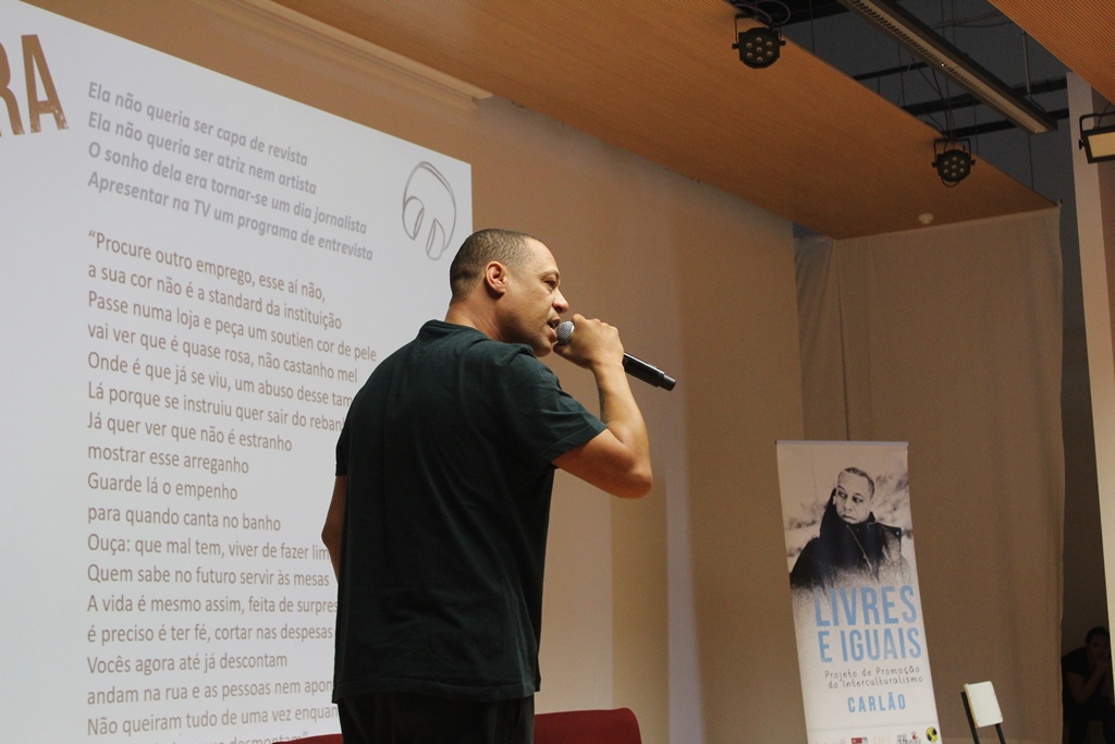 Carlão falou com os jovens e cantou os três temas que fazem parte deste livro “Livres e Iguais” - Projeto de Promoção do Interculturalismo. E depois, para fechar a sessão, deixou um dos seus temas atuais e que, de certa forma, também tem a ver com estes temas, o “Assobia para o Lado”.