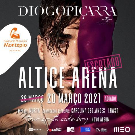 É adiado, uma vez mais, o grande concerto que marca a sua estreia de Diogo Piçarra na Altice Arena. Inicialmente agendado para dia 28 de março de 2020, foi adiado para 12 de setembro e é agora novamente adiado para 20 de março de 2021.
