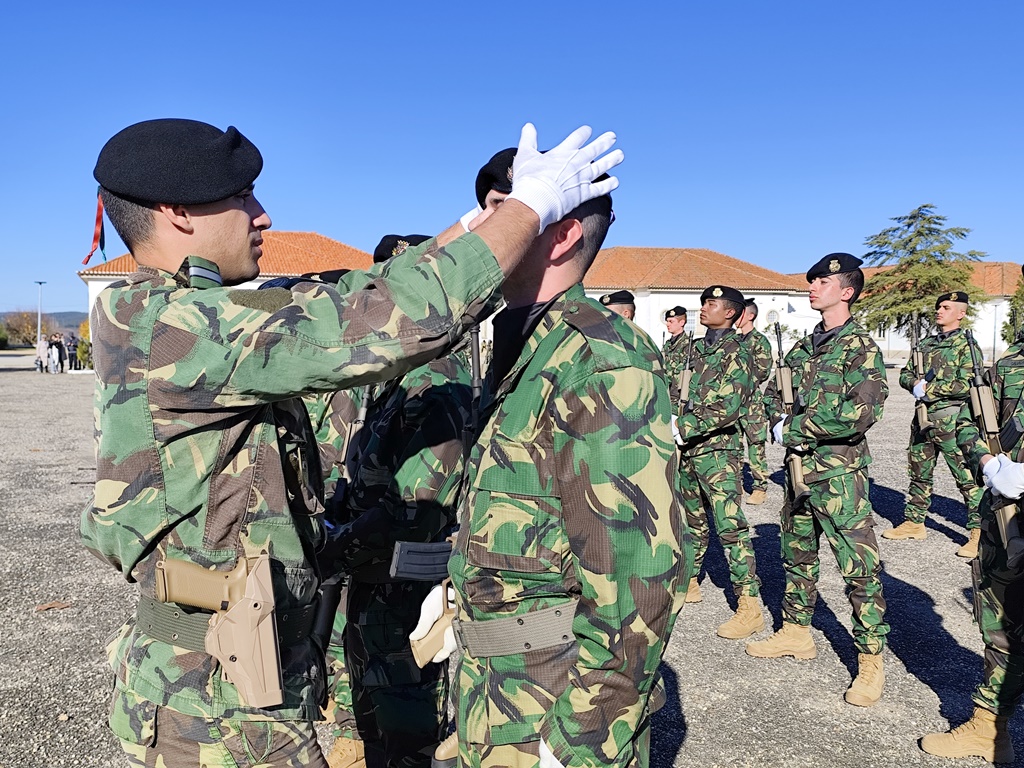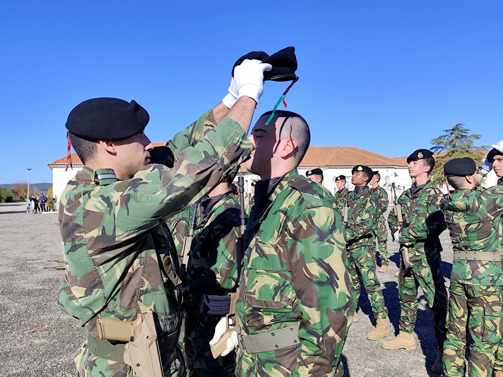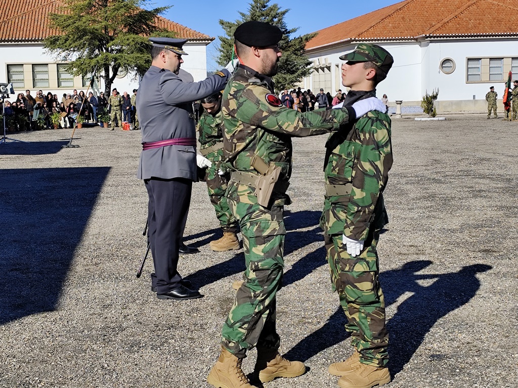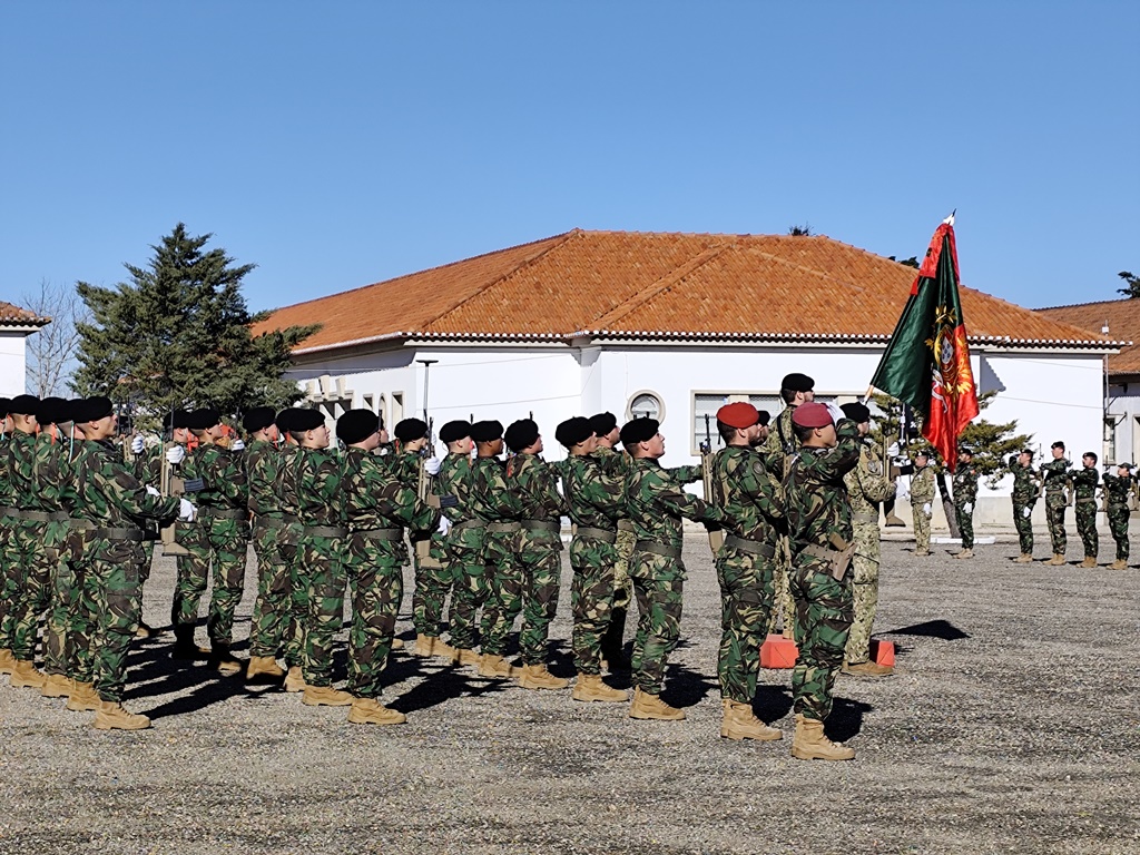 Para fechar a atividade os jovens, e pais, assistiram à cerimónia de Juramento de Bandeira do 7.º curso de 2024 de mais uma recruta. Um dos momentos altos da vida de qualquer militar que assenta no primeiro juramento perante o Estandarte Nacional e, logo depois, estarem em prontidão para receber a sua boina.